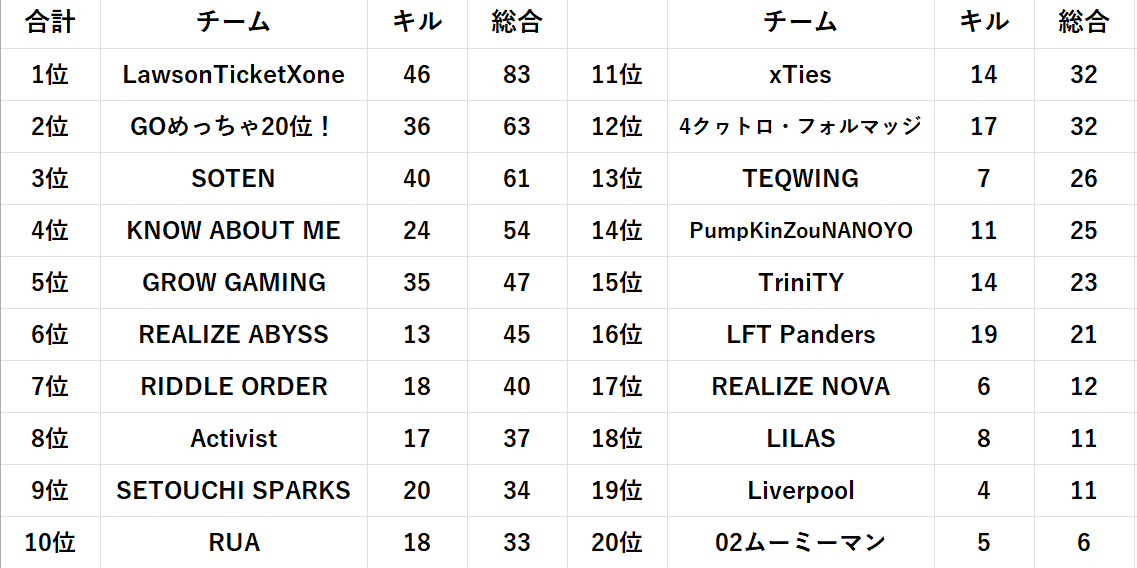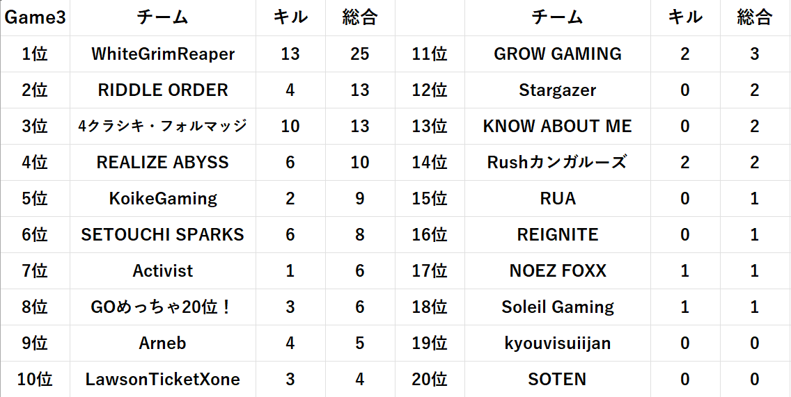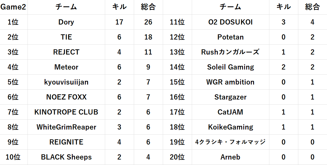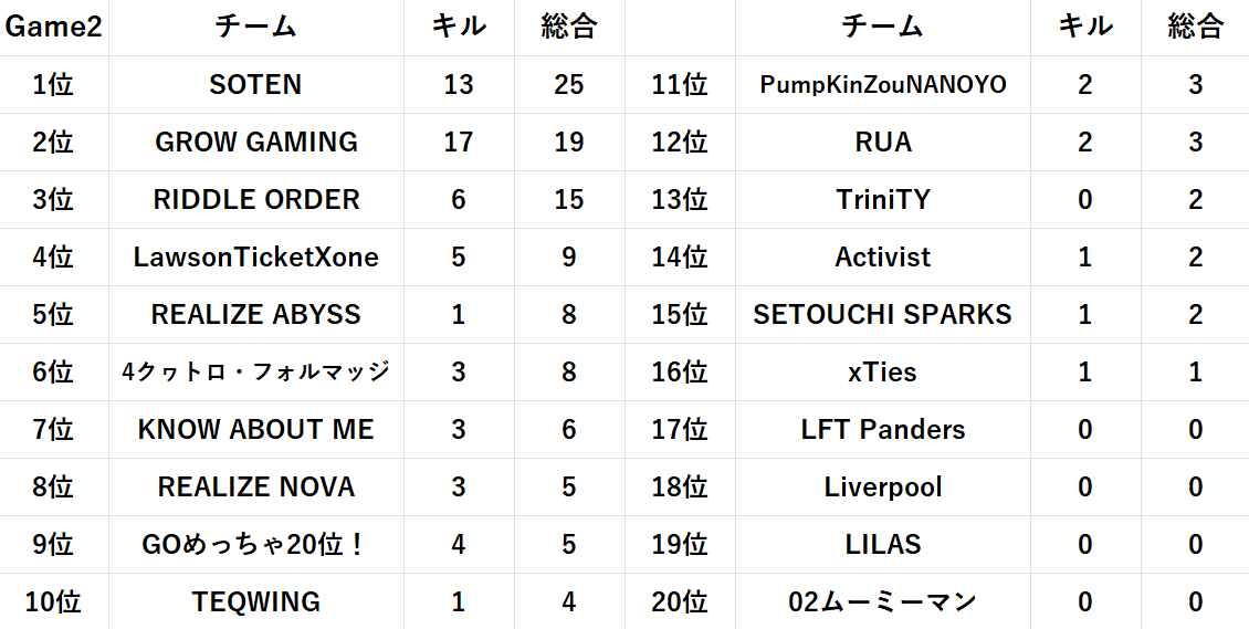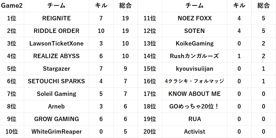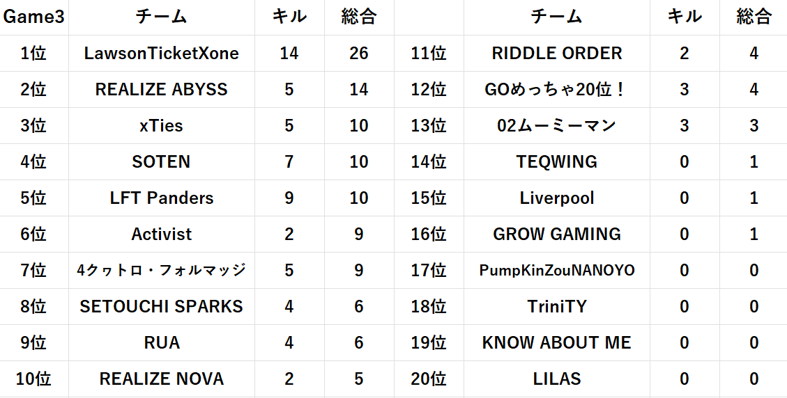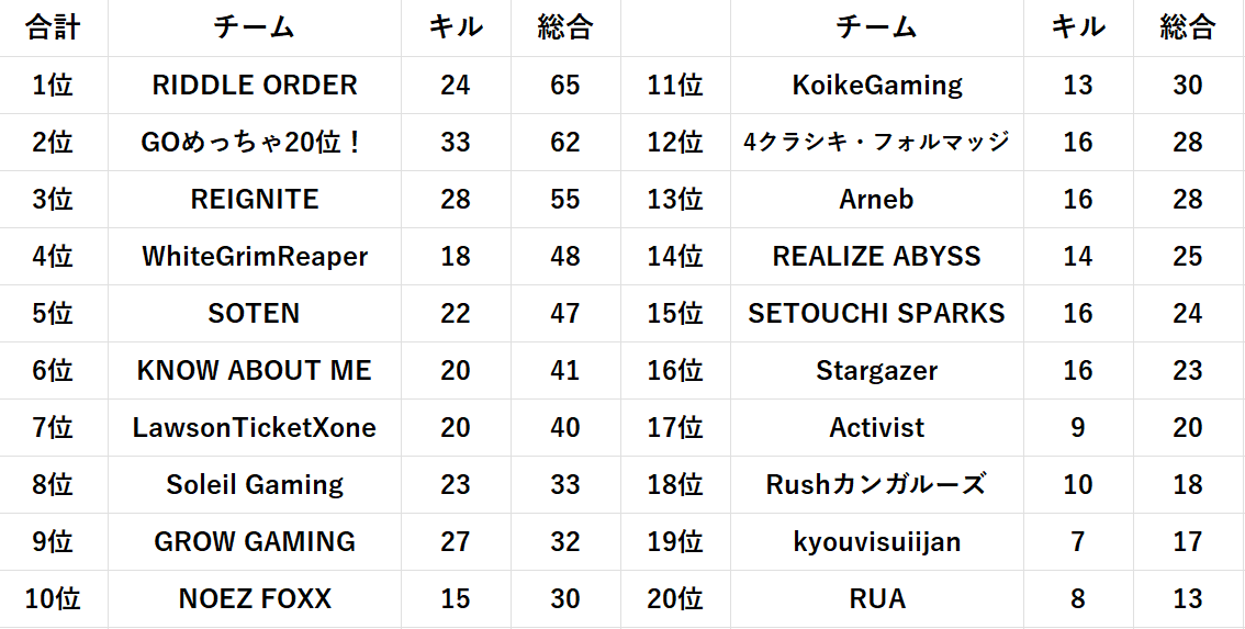 ここで上位10チームに残ると、DAY3に行われるマッチポイントファイナルズへの出場が確定します。