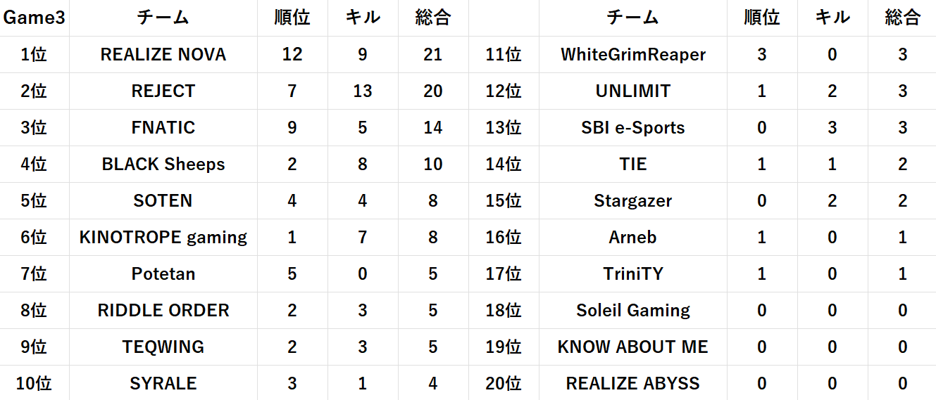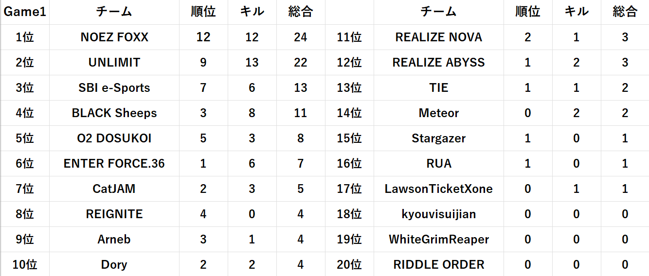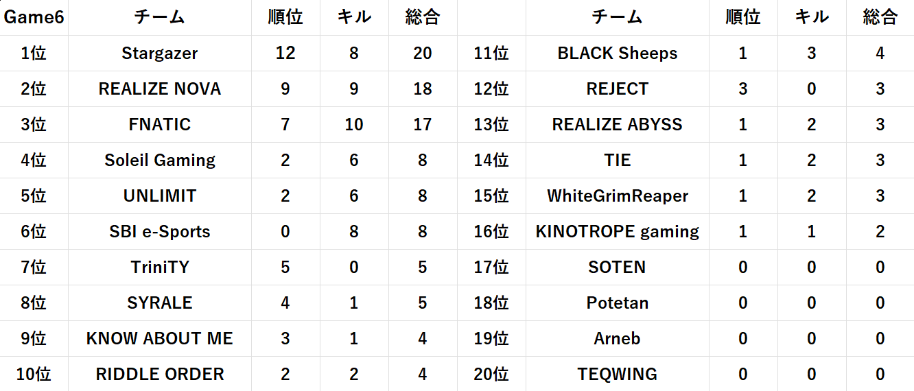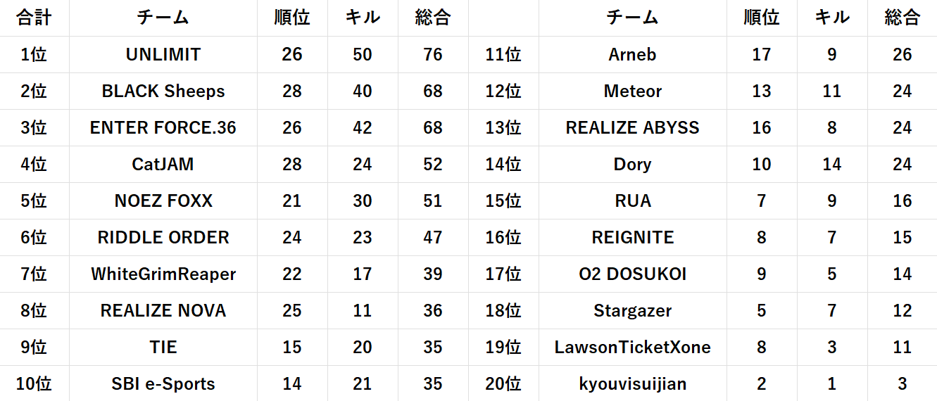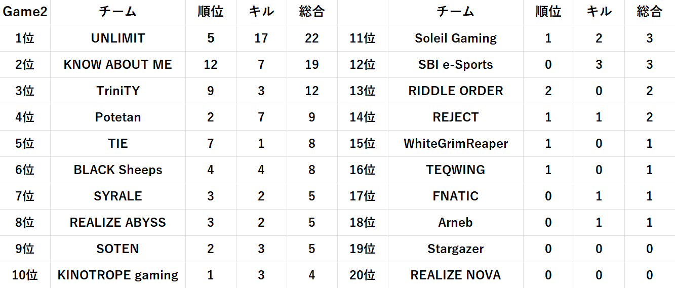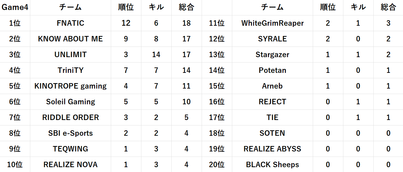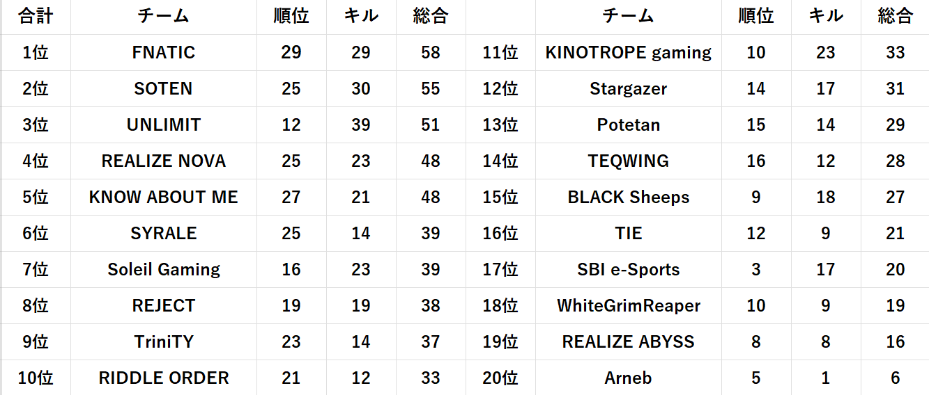 前半戦のAvsCではキルポイントを大量に稼いだUNLIMITが、BvsCでは順位もキルも安定して獲得するという試合運びを見せたFNATICがそれぞれ首位を獲得するという対照的な結果となりました。