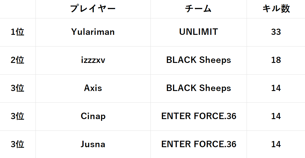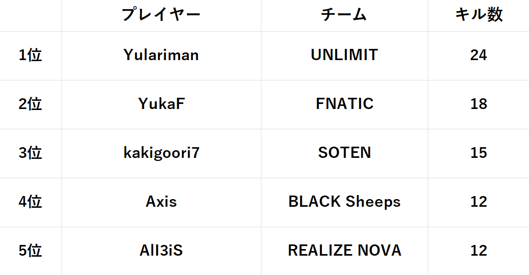 UNLIMITのゆらりまん選手が33キルと圧倒的な成績となりました。