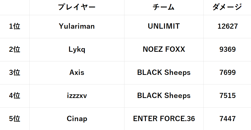 こちらもキルランキングと同様にUNLIMITのゆらりまん選手が12627ダメージと大活躍を見せました!