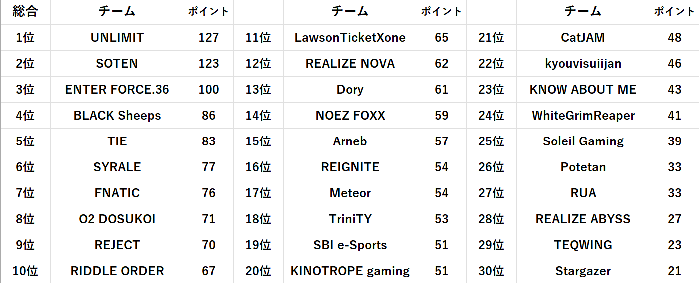 また、リージョナルファイナルの結果も総合獲得ポイントには入るため、現在の成績はレギュラーシーズンを終えた暫定的な成績となります。