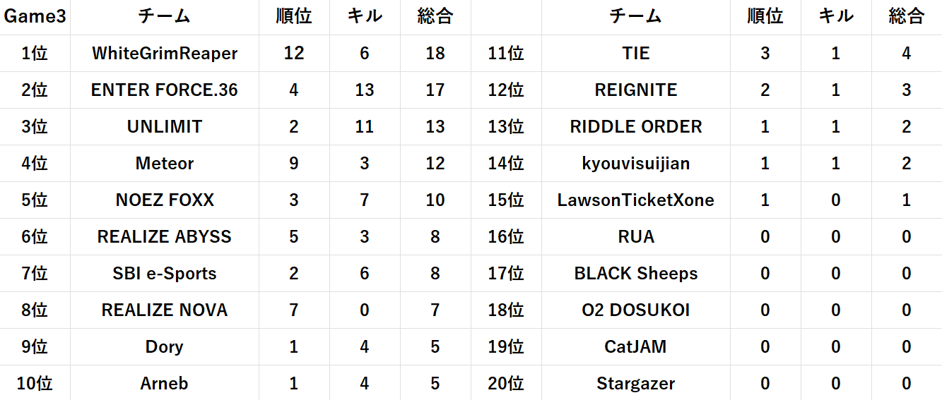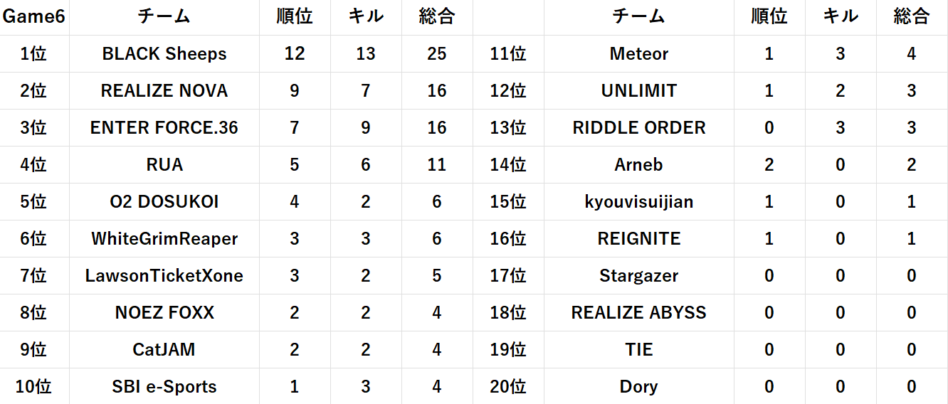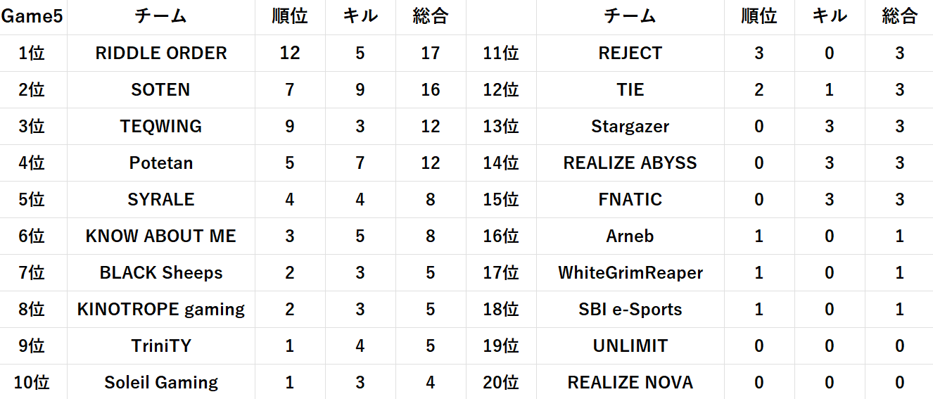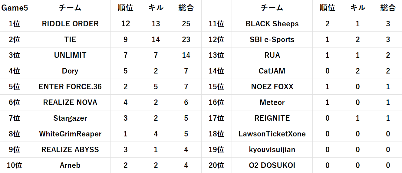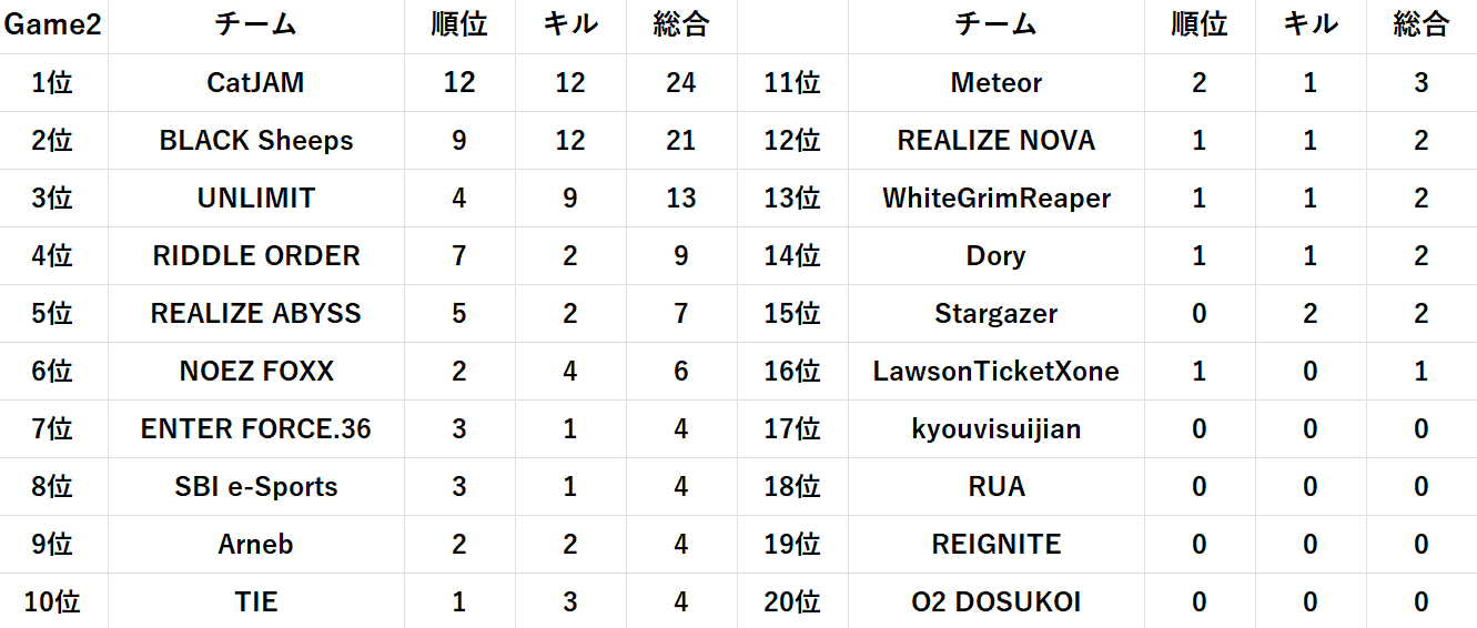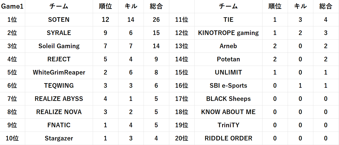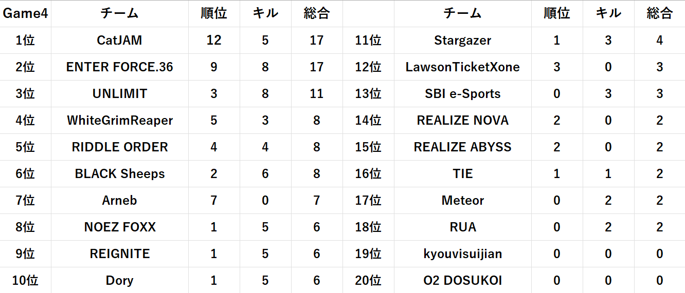 ポイント表を見ても分かるように、ファイトが強いチームがキルポイントで稼いで上位につけるというマッチアップとなりましたね。