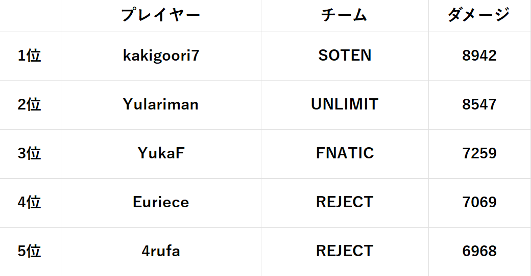 ダメージランキングでは、チャンピオンとなった1試合目に3553ダメージを獲得したSOTENのkakigoori7選手が首位となりました。